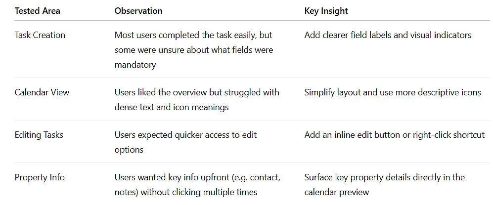 helped identify common challenges agents face in task creation, delivery scheduling, and updating property status. By clustering related issues and needs, I was able to prioritize simplifying the task creation process and enhancing the usability of the calendar view.