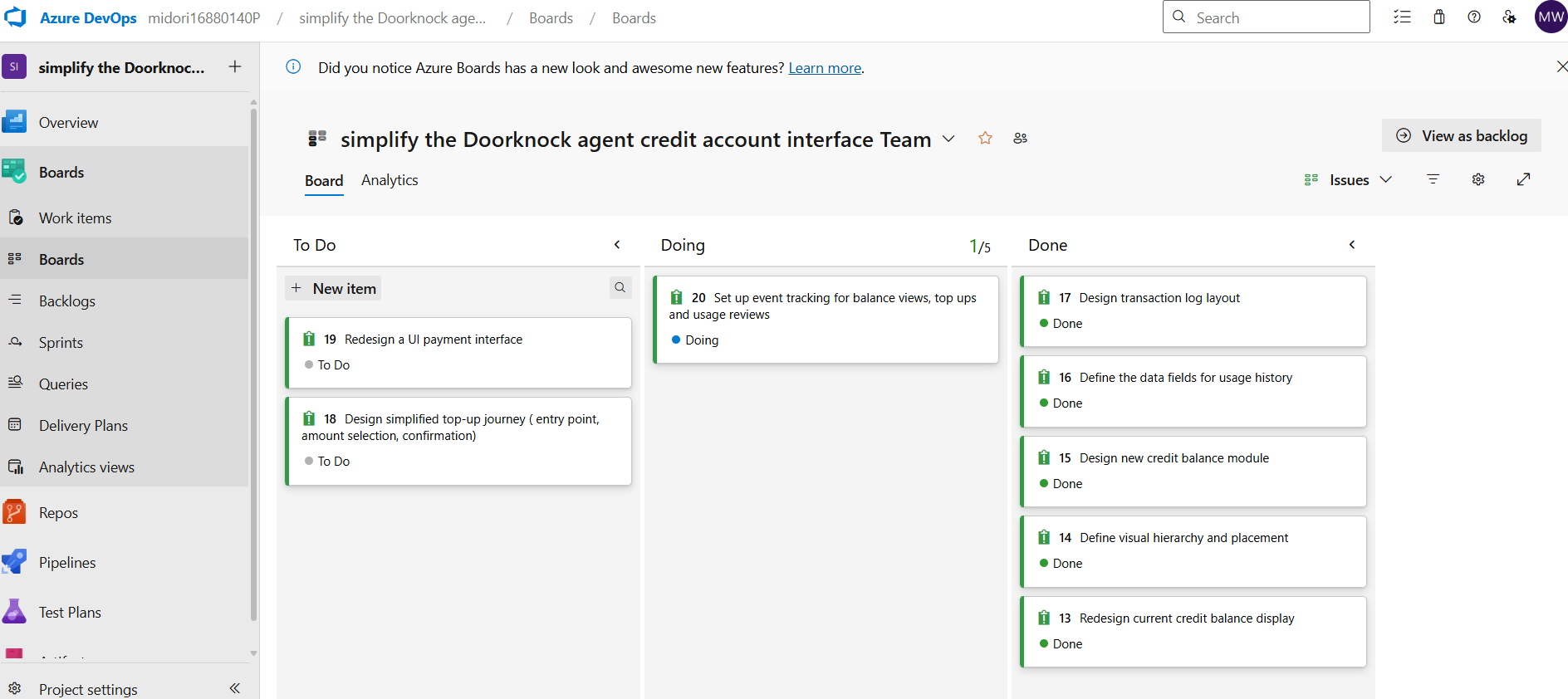 Using Azure DevOps and agile sprint planning, I organised tasks, tracked progress, and collaborated with the team to deliver a simplified interface that helps agents easily understand their credit balance, top-up history, and usage summary.
