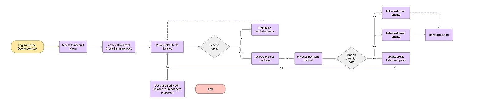 Creating a user flow helped map out how agents interact with the credit system—viewing balances, checking usage, and topping up. This made it easier to spot friction points and guided ideation by highlighting where the experience could be simplified. T