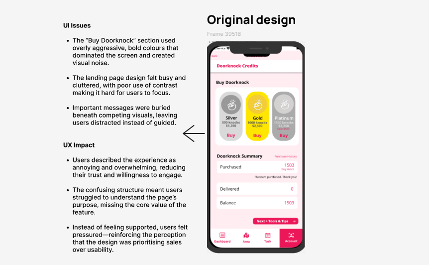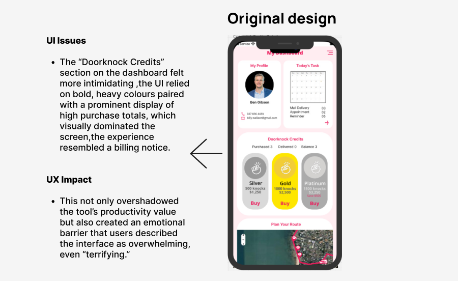 Through user interviews and observation, I discovered that agents often hesitated or delayed using credits due to lack of transparency in the UI. Some misinterpreted the balance, while others were unsure how or when to top up. This directly impacted engagement and user confidence in the platform.
